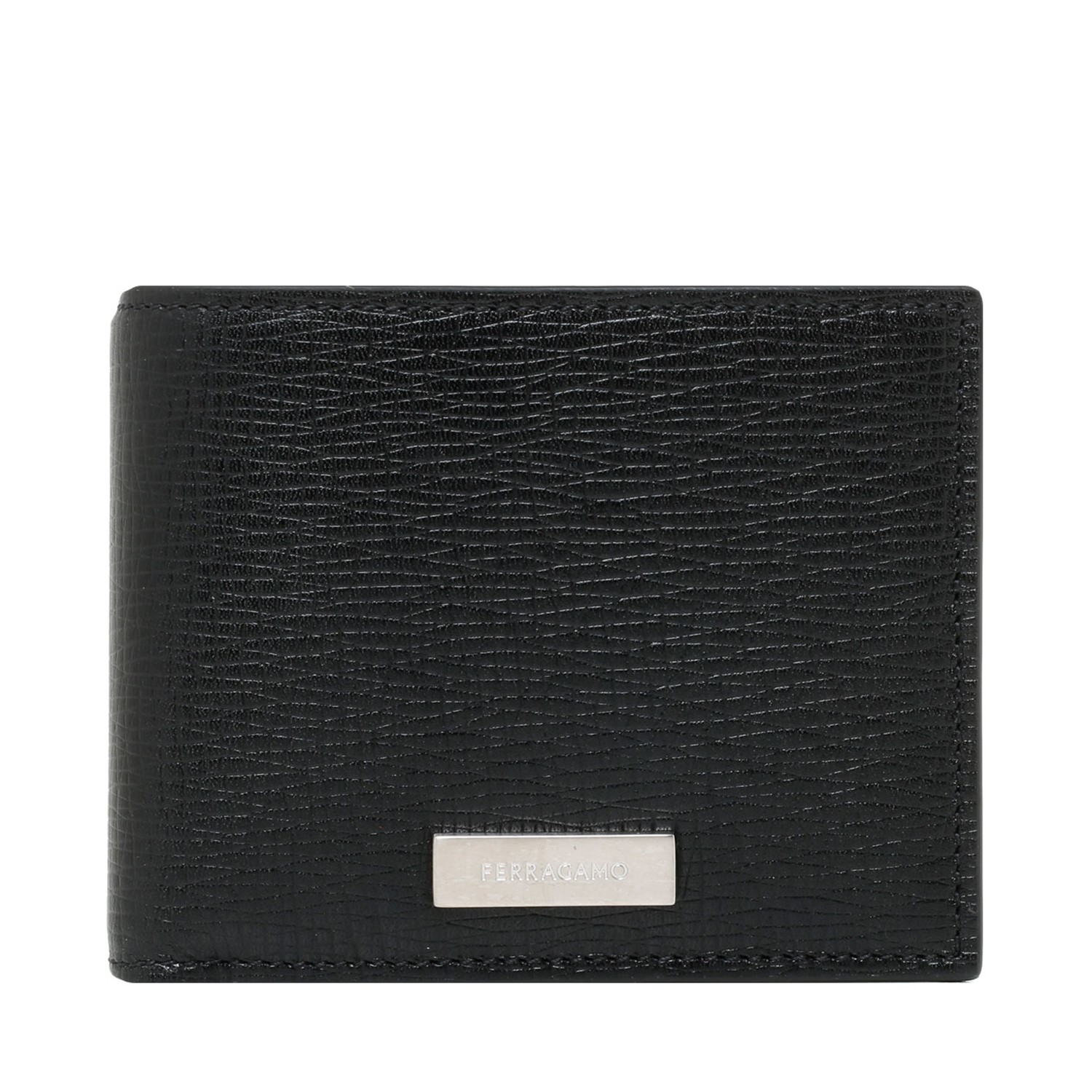Ferragamo Black Wallet. Black leather card holder, grainy calfskin, brushed metal plate, engraved Ferragamo logo. Internal cards and banknotes compartments, embossed logo.