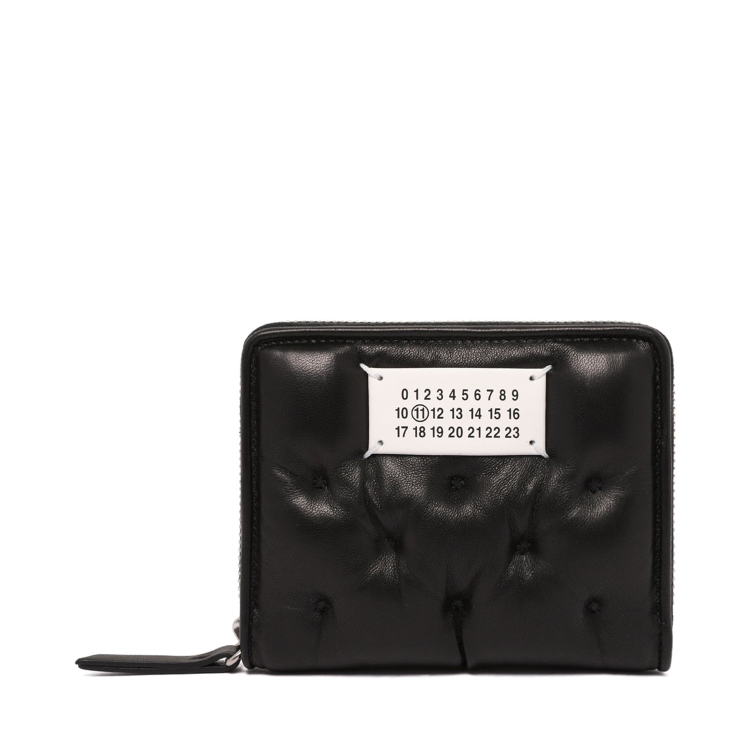 Maison Margiela Black Glam Slam Quilted Wallet Small. The Glam Slam small wallet is crafted from specially quilted nappa leather, features a zippered design, and an internal zippered coin pocket, a numerical logo tag on the front.
