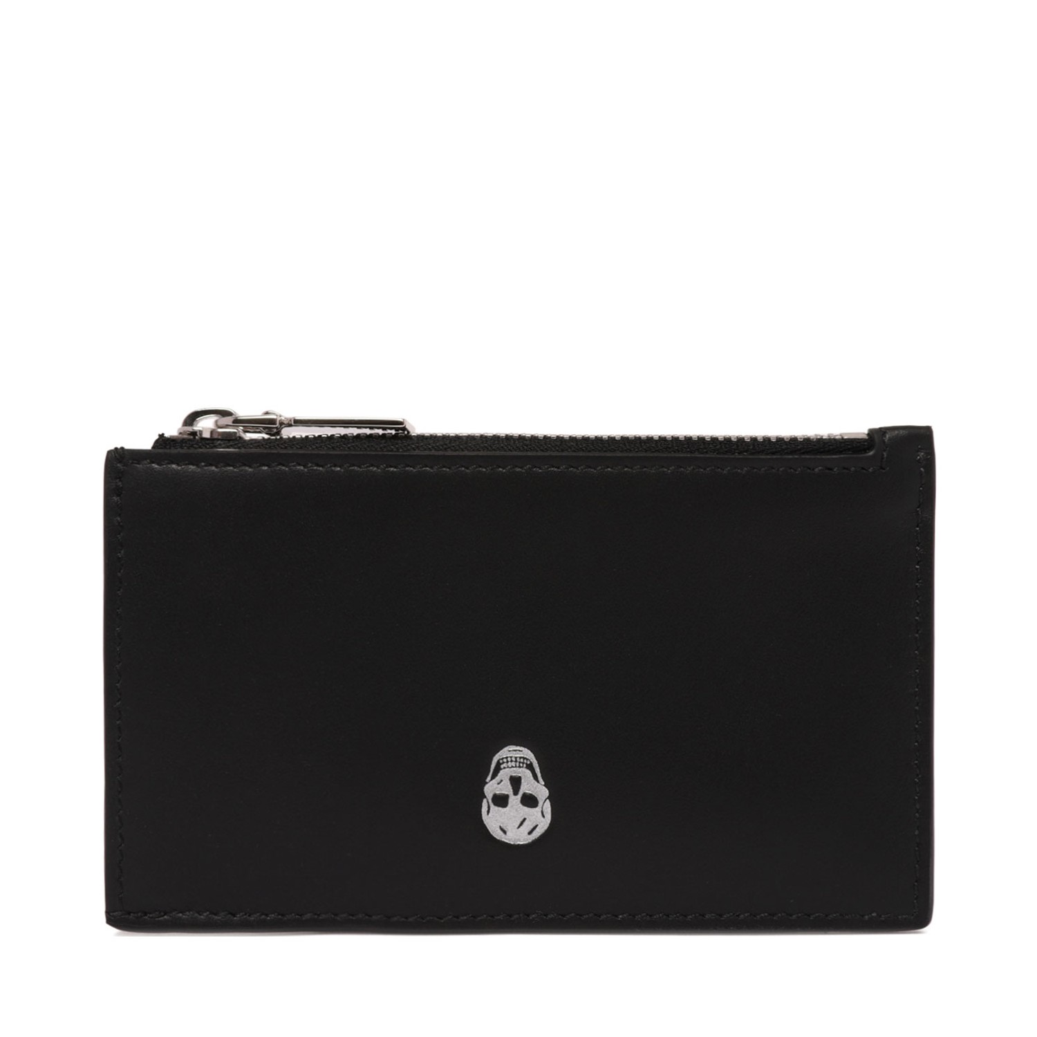 Alexander McQueen Black Zippered Leather Wallet. Black calf skin wallet with silver-tone logo detail, zip closure, internal card slots, smooth finish.