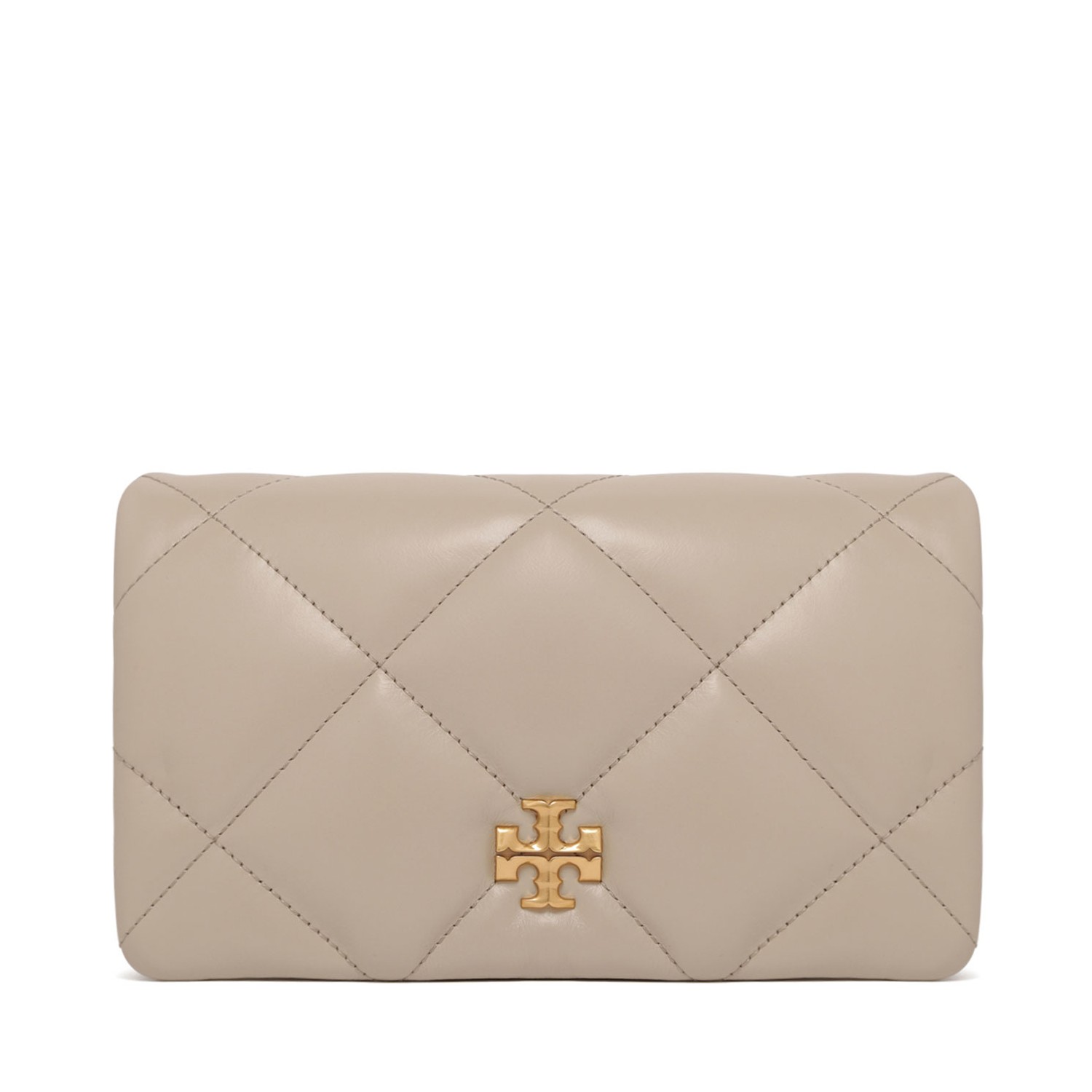 Tory Burch Light Stone Kira Chain Wallet. Light stone quilted chain wallet, flap with magnetic closure. Removable and adjustable chain shoulder strap, height 56.5 cm with leather insert on the shoulder. One external pocket on the back, one internal zip pocket, two internal card pockets. Quilting technique.