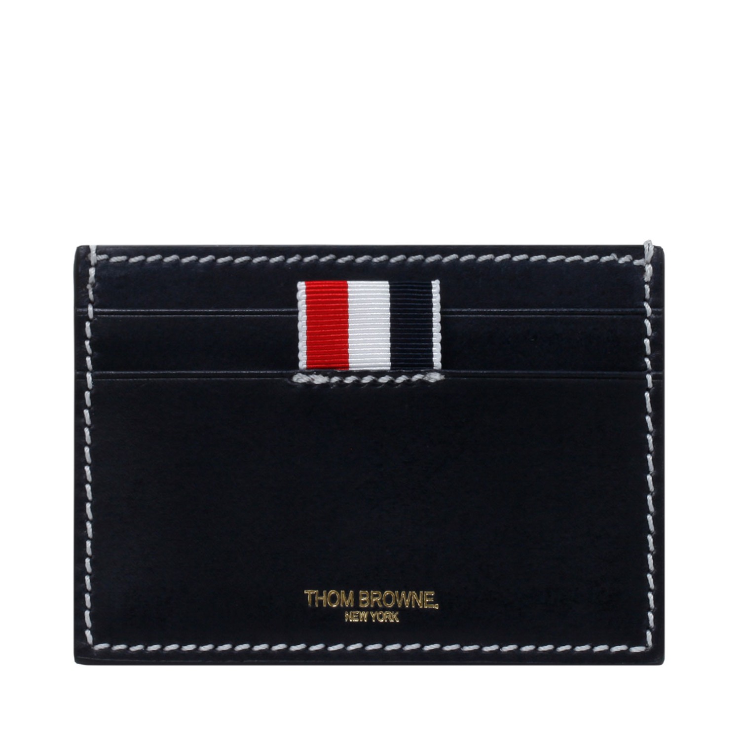 Thom Browne Navy RWB Tab Leather Cardholder. Navy lather cardholder, gold tone logo stamp to the front, contrasting stitching, tricolor tab to the front.