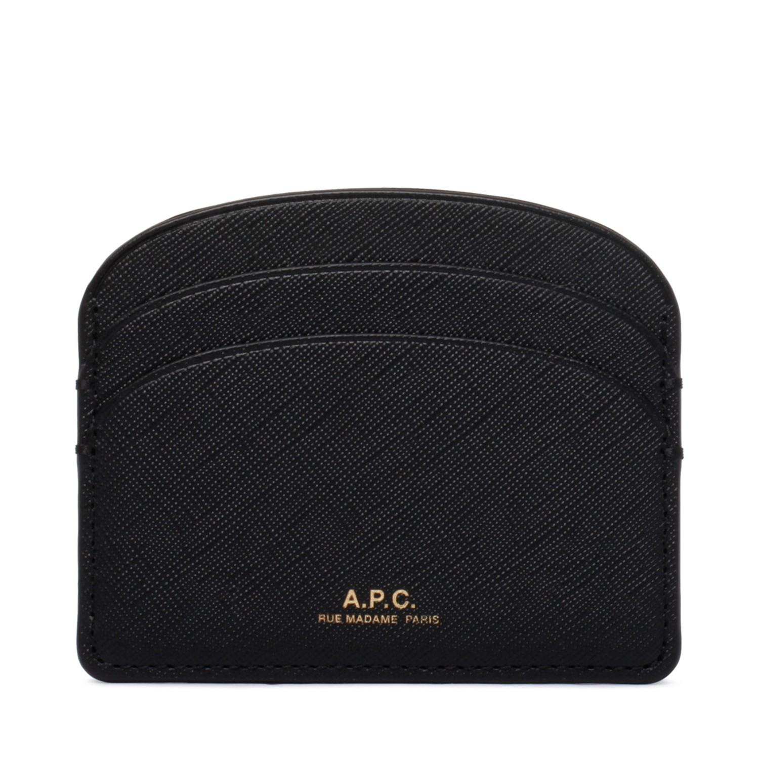 A.P.C. Black Foil Print Cardholder. Black calf leather cardholder, gold printed logo on the front, two credit card slots and one central pocket.