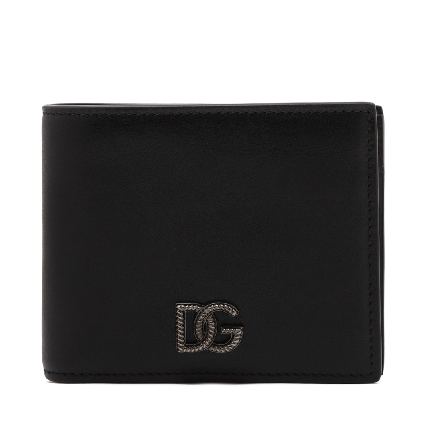 Dolce & Gabbana Black Leather Wallet. Black wallet made of calfskin enriched by a metal DG detail on the front. Interior with one bill compartment, one coin pocket, two slot pockets and four credit card slots.