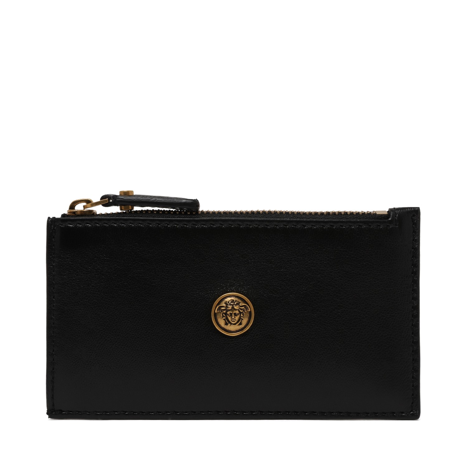 Versace Black Lamb Leather Zip Card Case. Black zip card case defined by a sleek, refined design. Crafted from smooth premium lamb leather, this Versace card holder features a compact rectangular silhouette that combines practicality with timeless elegance. The minimalist black surface is enhanced by the iconic gold-tone Medusa emblem at the center, creating a distinctive signature detail that reflects the brand