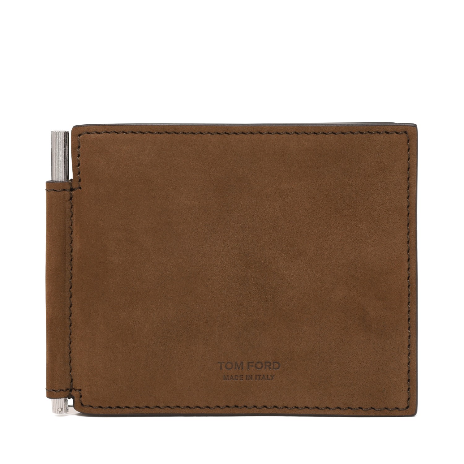 Tom Ford Brown Leather Wallet with Money Clip. Brown leather wallet defined by a sleek, minimalist silhouette and refined Tom Ford craftsmanship. Crafted from smooth premium leather with a rich, natural finish, this bifold wallet features a clean design enhanced by discreet Tom Ford logo embossing on the front. The interior is thoughtfully structured with multiple card slots and a polished metal money clip, offering a practical and elegant solution for organizing essentials while maintaining a slim profile. Precise stitching and high-quality materials reflect the brand